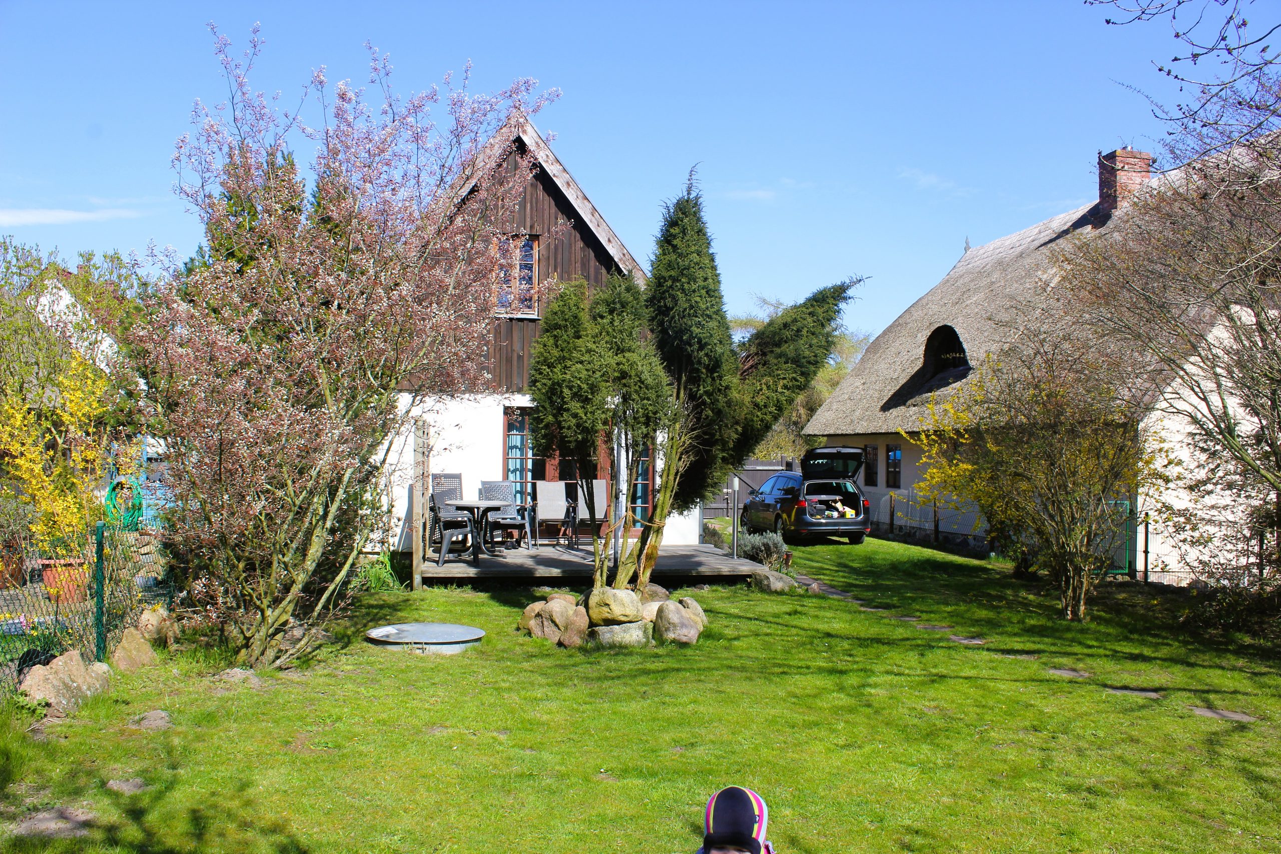 Das Haus bietet eine sonnige Süd-West-Terrasse mit hochwertigen Gartenmöbeln und Liegen sowie einen großen Garten zum Spielen und Entspannen. Elektrogrill und zwei PKW-Stellplätze sind vorhanden.