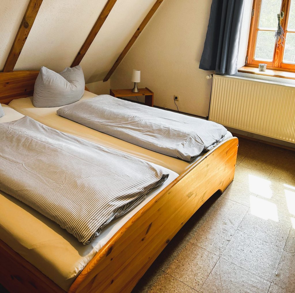 Zwei Schlafzimmer mit Holzbalkendecke, jeweils Doppelbett (zwei Matratzen), Kleiderschrank und Kofferablage.